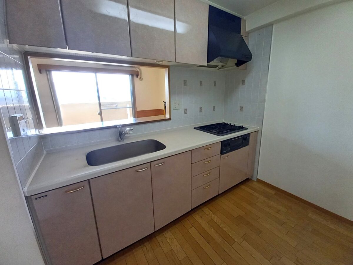 壁に囲われて独立していたキッチンを、間仕切りと吊戸を撤去してオープンなキッチンにしています。