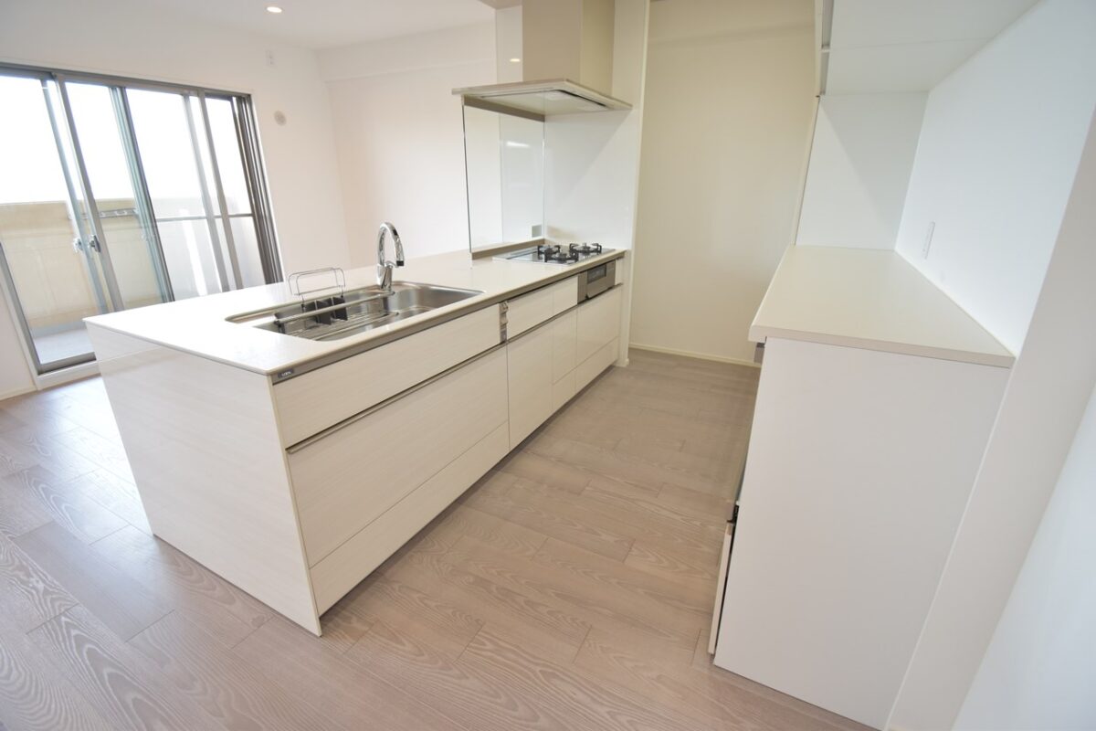 背面収納を備えたキッチンにしており、吊戸がなくなっても十分な収納量です。