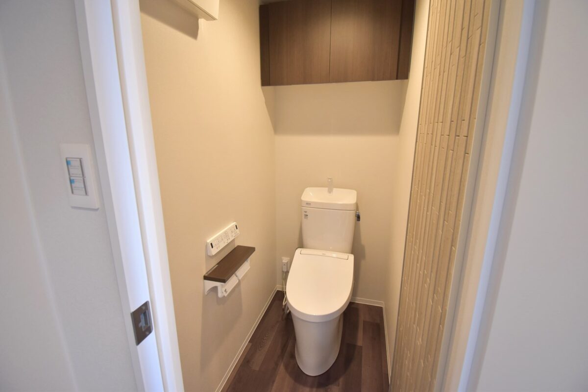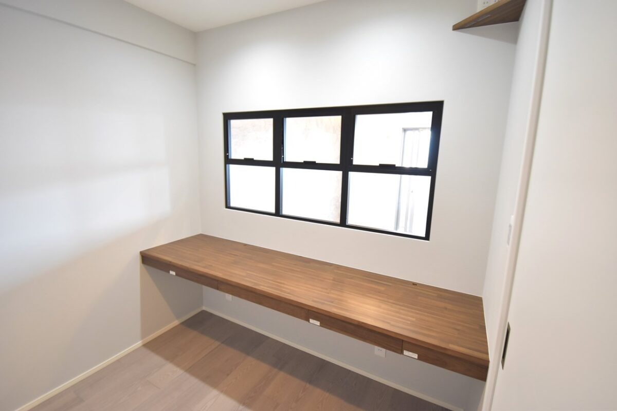 書斎に関しては、LDKとの間に室内窓を設けることで空間の広がりと意匠性を高めています。こちらも家事室と同じくインテリアカウンターを使用し、壁いっぱいの幅のデスクを設けています。背面に本棚を置いても悠々と作業ができる程度の広さを確保しています。