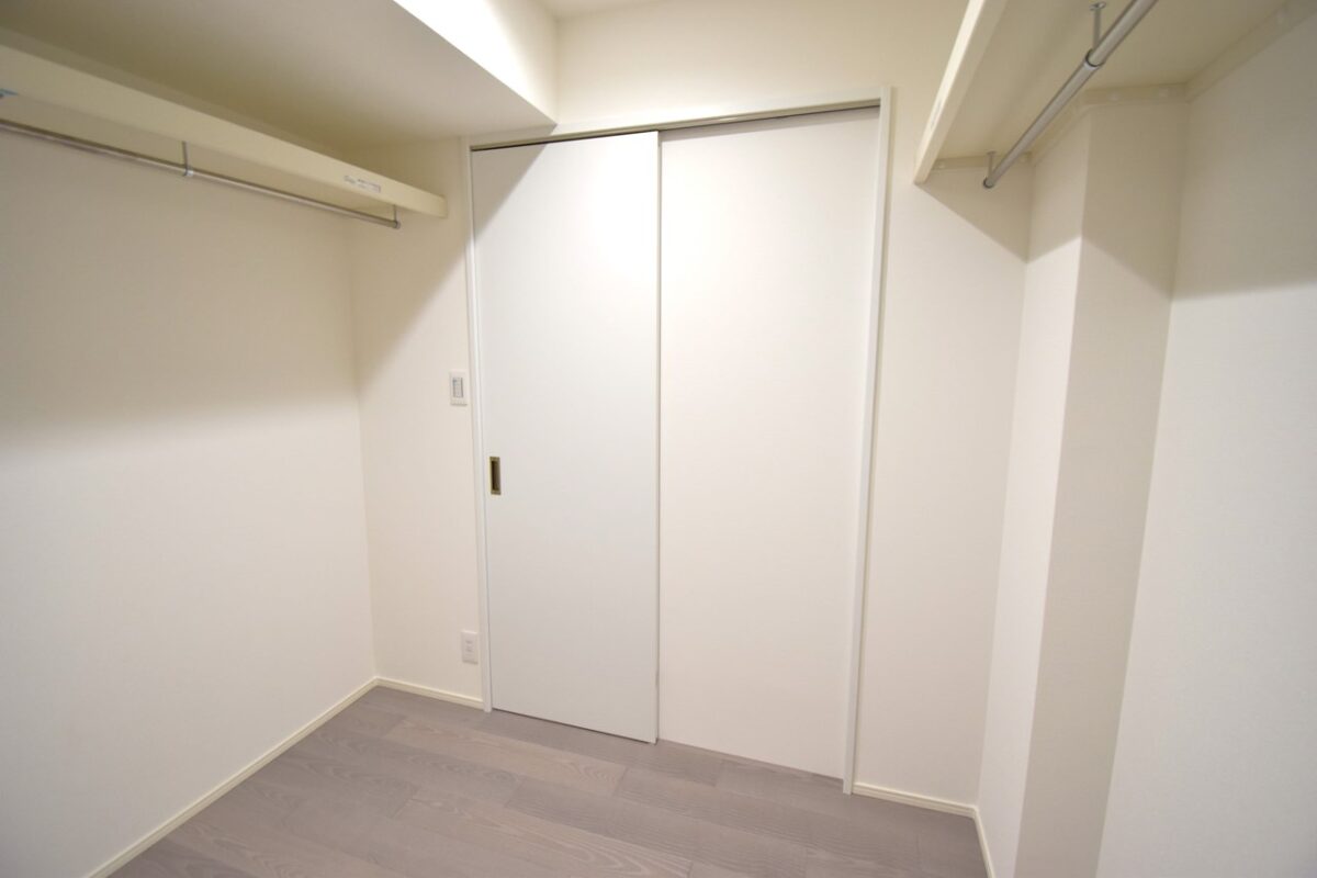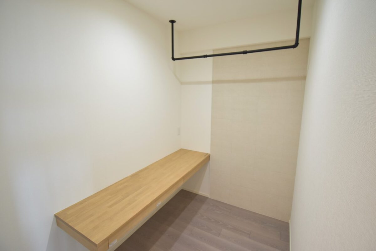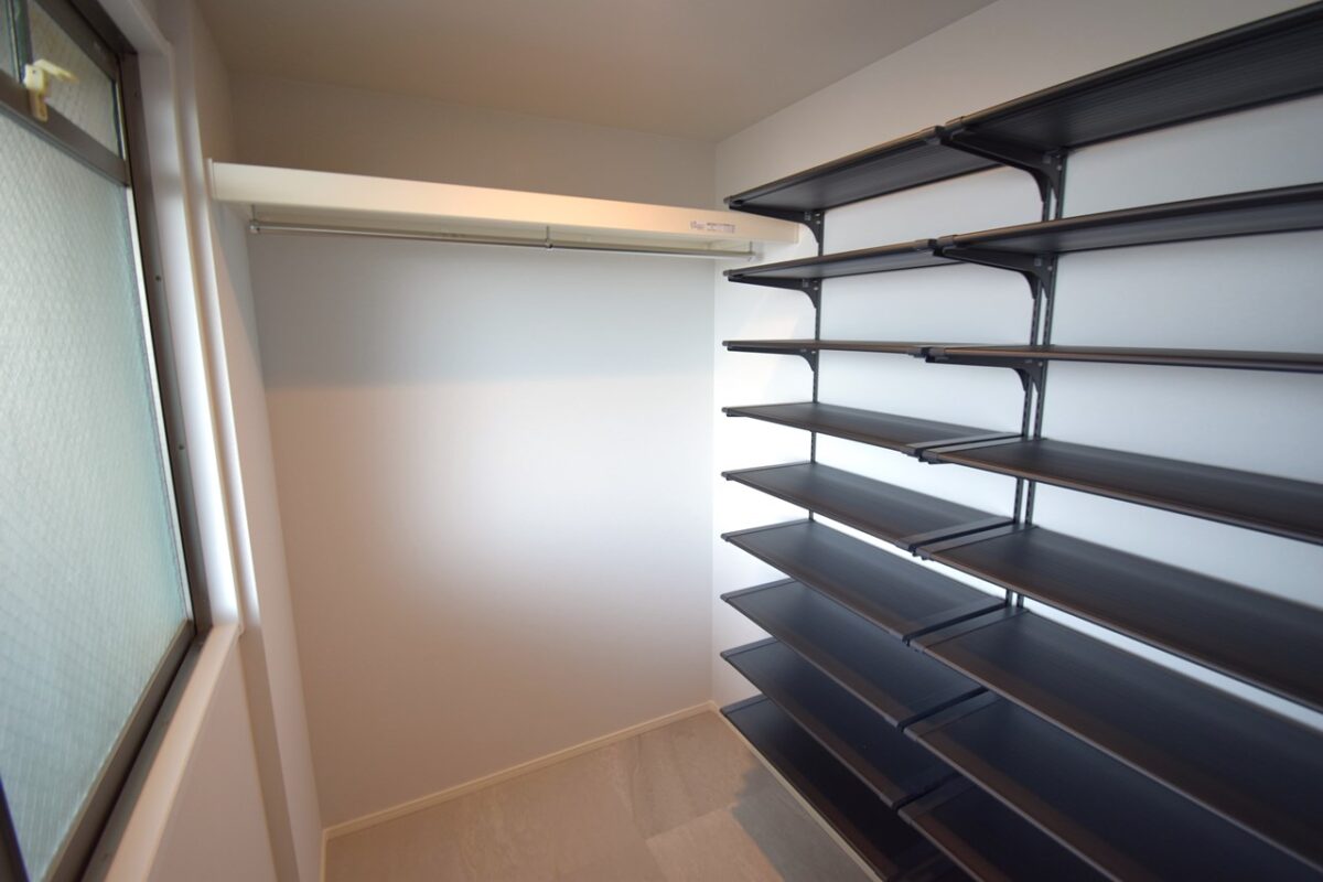 シュークロークには枕棚とハンガーパイプを設置し、毎日使うコートなどを見えないところにしまっておく事ができます。別の壁一面には樹脂製可動棚を目一杯新設しており、十分な収納量を確保しています。