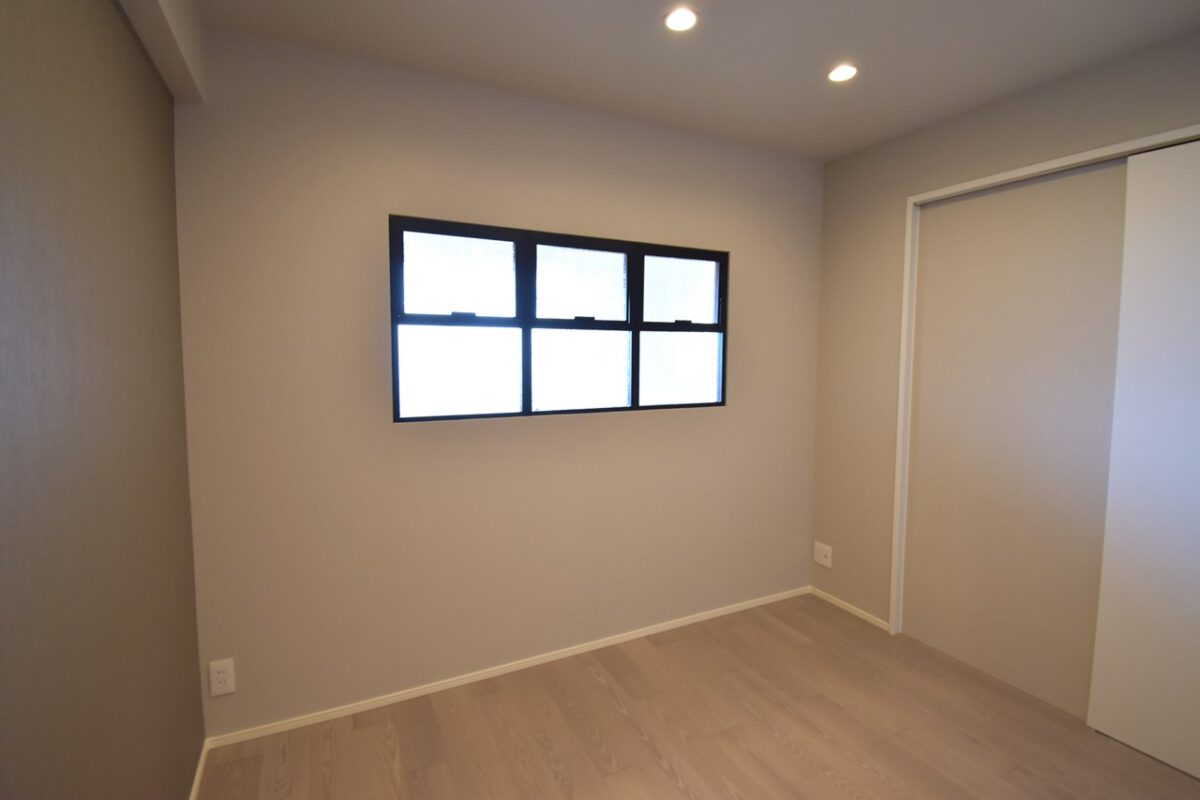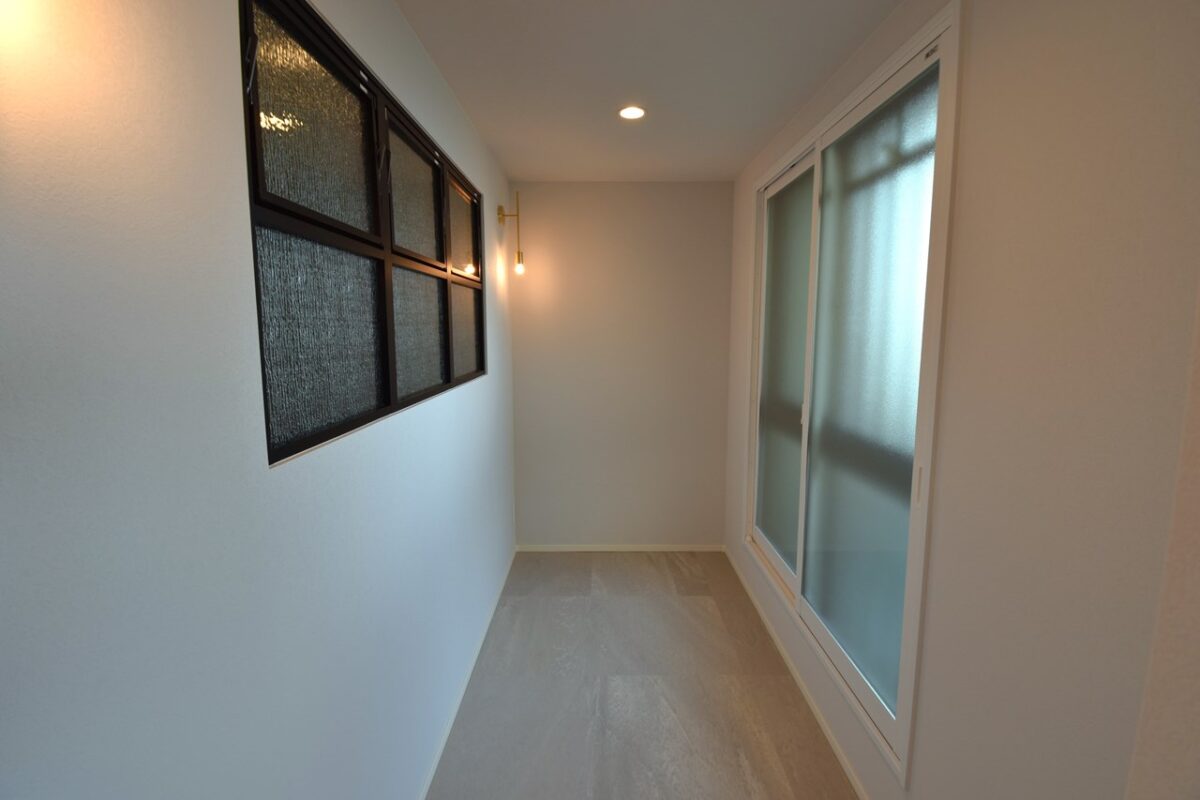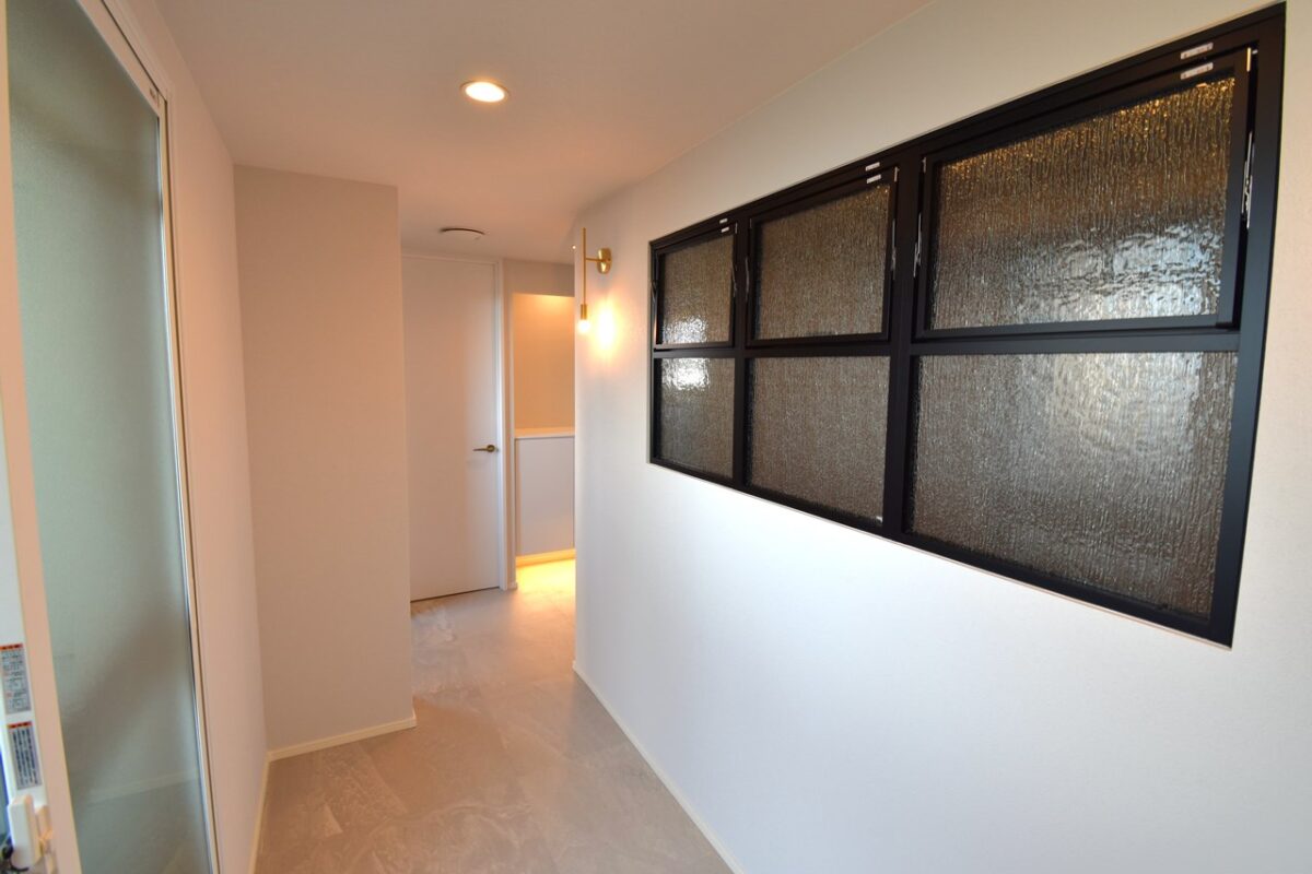 各所に設けた室内窓は、艶のないブラックで、シックな印象に仕上げるアクセントとなっています。